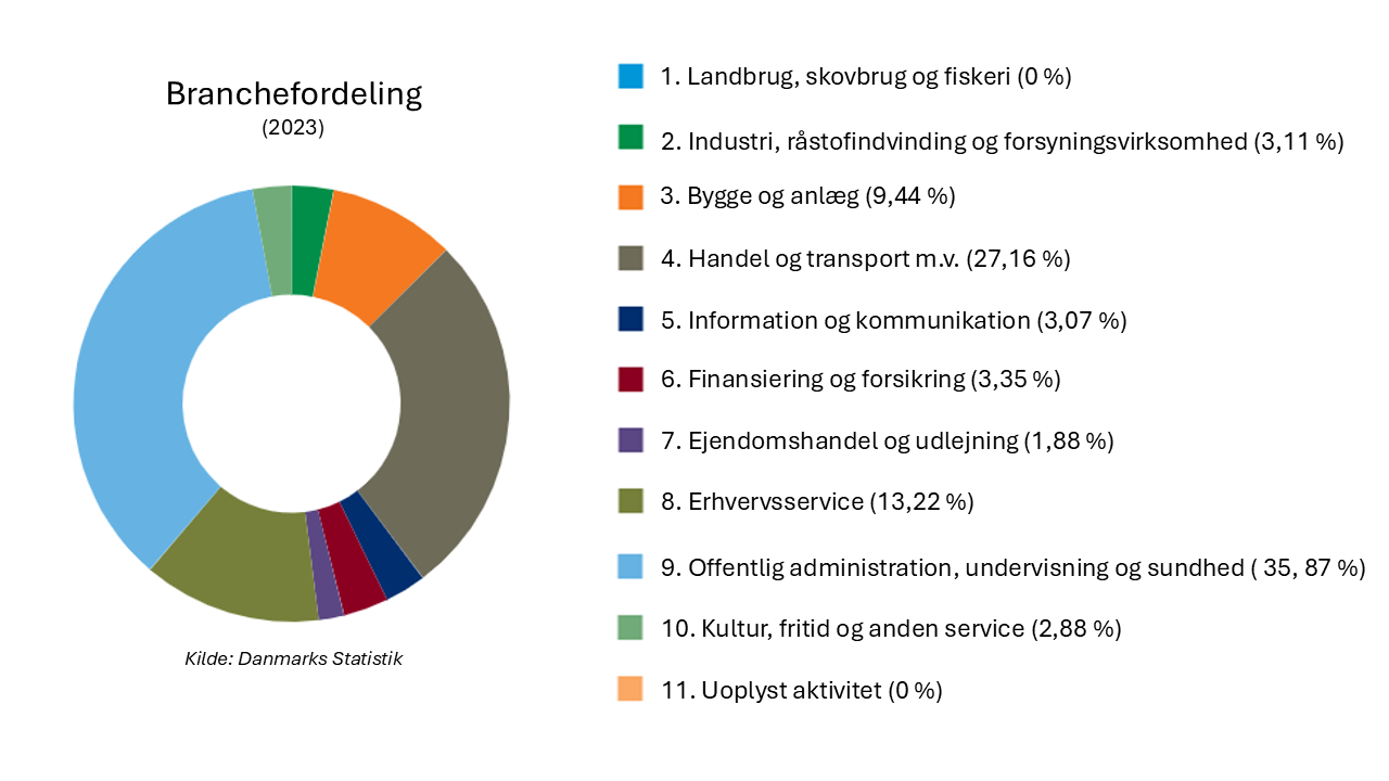 Af diagrammet herunder kan det ses, hvor mange procent hver branche udgjorde af det samlede antal arbejdspladser i Glostrup i 2023.