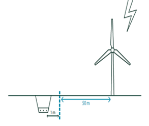 - Høje elektrisk ledende objekter nær eltransmissions jordkabelanlæg bør ikke placeres nærmere end 50 m fra respektafstanden til jordkabler, uden foranstaltninger for beskyttelse mod spændingsstigning i jorden.