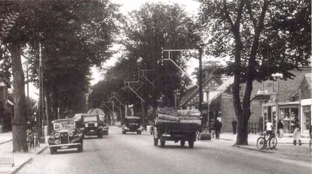Hovedvejen set mod øst i 1938. Efterhånden kom der flere og flere biler til, og i dag er Hovedvejen fortsat en vigtig færdselsåre mellem København og Roskilde. Kilde: Glostrups Historie af Hans-Henrik Rasmussen, 2009.